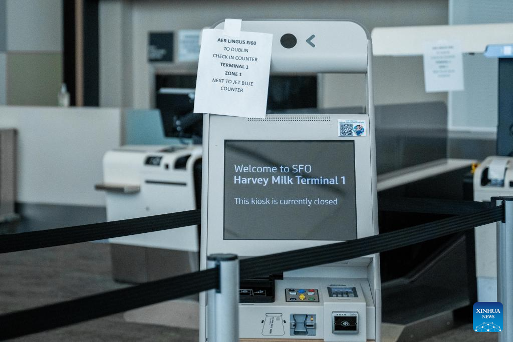 A closed self-check-in kiosk is seen at San Francisco International Airport in San Francisco, California, the United States, Nov. 10, 2025. Thousands …[More]