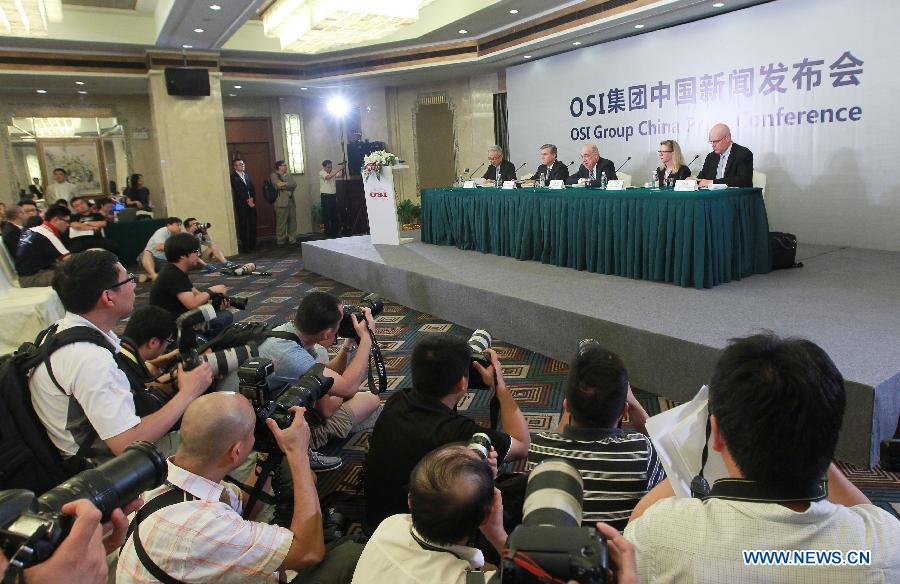 Members of the management team of OSI Group, the parent company of meat supplier Shanghai Husi Food Co., Ltd, attend a press conference in east China's Shanghai Municipality, July 28, 2014. Earlier this month, a local TV station reported that Shanghai Husi Food Co., Ltd mixed fresh and expired meat, which is widely consumed in global food brands including McDonald's Corp, KFC-parent Yum Brands Inc. and Starbucks Corp.. David McDonald, president of OSI Group, said OSI will make fundamental changes in its China operations. (Xinhua/Pei Xin)