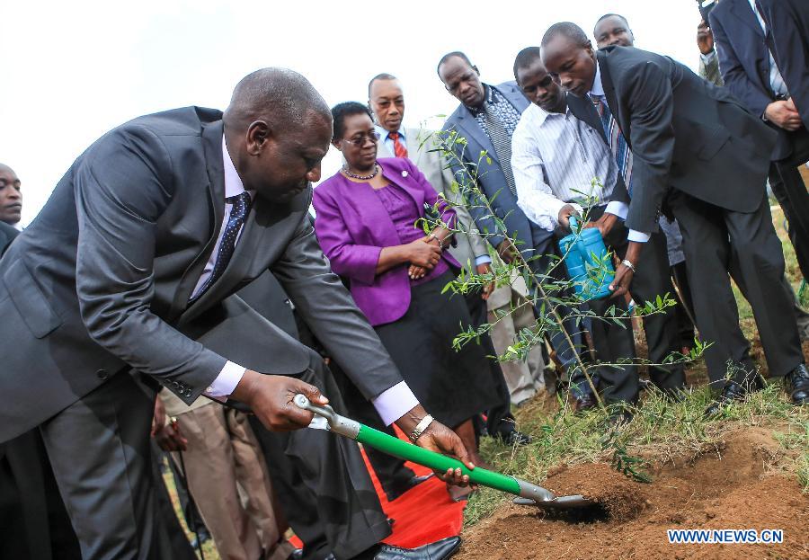 | Kenyan Deputy President William Ruto (L) plants a tree during the groundbreaking ceremony of Sino-Africa Joint Research Center at the Jomo Kenyatta University of Agriculture and Technology in Nairobi, capital of Kenya, Dec. 4, 2014. The purpose of setting up this research center, which was approved in May 2013, is to accommodate the needs of science, technology and socioeconomic development of African countries. The construction of the main building and the affiliated botanic garden is completely sponsored by the Chinese government. (Xinhua/Meng Chenguang) |