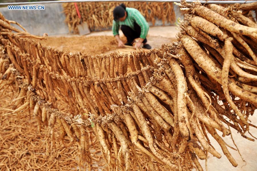 A woman classifies sun-dried Chinese herbal medicines in Weining County, southwest China's Guizhou Province, March 26, 2015. The planting area of herbal medicines stood at 161,000 mu (about 10,733 hectares) in 2014 in the county, with a production value of over 700 million yuan (112.6 million U.S. dollars). (Xinhua/Yang Wenbin)