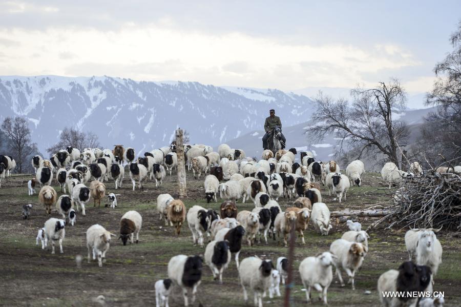 Photo taken on April 14, 2015 shows a shepherd driving flocks of sheep back towards his sheepfold in Hejing County of the Mongolian Autonomous Prefecture of Bayingolin, northwest China's Xinjiang Uygur Autonomous Region. Livestock production enters a peak season in the mountain areas of Bayingolin since the beginning of April. (Xinhua/Jiang Wenyao)