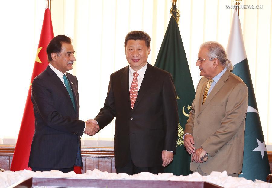 Chinese President Xi Jinping (C) meets with Pakistani Senate Chairman Mian Raza Rabbani (R) and National Assembly Speaker Sardar Ayaz Sadiq, in Islamabad, Pakistan, April 21, 2015. (Xinhua/Yao Dawei)