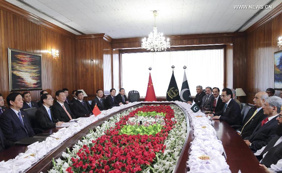 | Chinese President Xi Jinping meets with Pakistani Senate Chairman Mian Raza Rabbani and National Assembly Speaker Sardar Ayaz Sadiq, in Islamabad, Pakistan, April 21, 2015. (Xinhua/Lan Hongguang) |