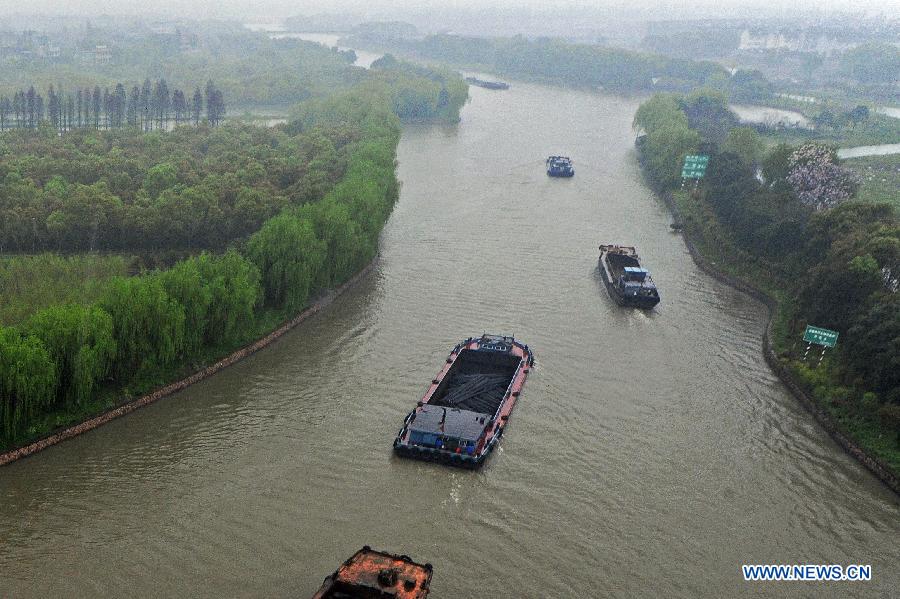 Photo taken on April 6, 2015 shows ships floating on the Jiaxing section of the Beijing-Hangzhou Grand Canal, east China's Zhejiang Province. According to official statistics, the first quarter GDP of Zhejiang reached 834.2 billion RMB, an 8.2 percent increase as compared with the same period last year. The service industry was the biggest contributor to this growth. (Xinhua/Tan Jin)