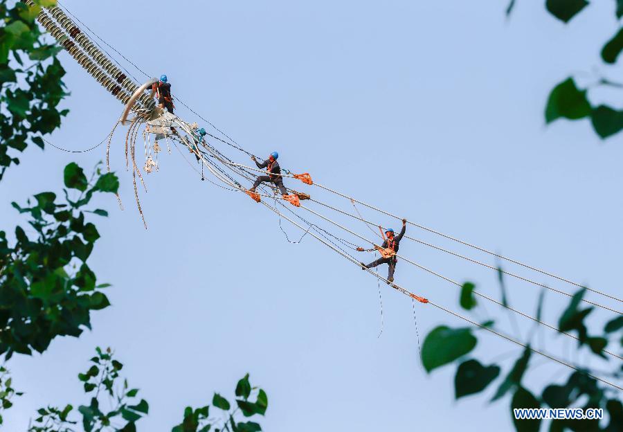 Workers work on 1,000-kilovolt power transmission project about a hundred meters above the ground in Wangdian Township of Huai'an City, east China's Jiangsu Province, May 30, 2015. (Xinhua/Zhou Haijun)