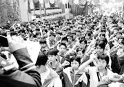 ˇˇˇˇStatistics show that more than 500,000 people have visited the Drug Ban Exhibition in Guangzhou, Guangdong Province since its opening in December 1998. Photo shows youngsters from a middle school are taking an oath, in front of the monument to a ban on using drug, that they will "cherish life, refuse drug" for the future of their motherland.