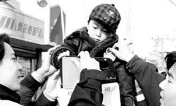 ĦĦĦĦThe charity activity to collect donations for the households with great financial difficulties began in Shanghai on January 3, helping the poorest to have a happy Spring Festival in 1999. Photo shows a kid also donates to them.