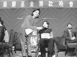 ˇˇˇˇYoung Chinese gymnast Sang Lan, paralyzed from a fall last summer, delivers a speech at a fund-raising evening party, which aims to collect money for providing economic aid and living guarantee for the Chinese girl.