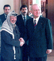 The Chairman of the Executive Committee of the Palestinian Autonomic Territories Yassir Arafat will end his visit to Germany on Wednesday. His visit to Germany is very successful. During his stay in Berlin he has met with many German politicians. German Chancellor Gerhard Schroeder had assured Arafat during their meeting that German Government would firmly back the aim of Palestinians to found their own state in their territories. The Palestinian state is expected to be proclaimed this autumn. Schroeder stressed that the declaration of the EU summit which was held just one year before in Berlin is still effective that the EU. backed firmly the founding of own state of the Palestinians and thought that the Palestinians had right to establish their own state in their region. Besides German Chancellor Arafat had had meeting with German Federal President Johannes Rau (Photo), German Parliament President Wolfgang Thierse, German Foreign Minister Joschka Fischer, German Finance Minister Hans Eichel and the former German minister for development aid and the expert for the affairs of the Middle East Hans-Juergen Wischnewski. In Arafat's opinion the negotiation which was held in Washington must be finished at latest till September 13th. He pointed out at press conference that he had to postpone proclamation of the founding of an own state because he was under the pressure of different sides. Arafat called Germany and other EU's nations to join in the peace process of the Middle East. In his opinion the EU. should play a very active role in it. But Schroeder stressed that Germany must take its steps within the frame of the EU. and the European cannot play as a leading role in the peace talks of the Middle East. At his meeting with Hans-Juergen Wischnewski Arafat conferred the order "Bethlehem 2000" to the famous SPD-politician in order to commend his contributions for promoting the peace case of the Middle East. Arafat praised Wischnewski as "friend of all Arabs". In Berlin Arafat had visited the Federal Printing House where since 1994 passports, credentials, papers, certificates and stamps were printed for Palestinians and up to now already more than 13 million exemplars had been made. Arafat travelled to Stuttgart on Tuesday and continued his visit. In Stuttgart he met with Prime Minister of the state of Baden-Wuerttemberg Erwin Teufel. Teufel showed also his support for the Palestinian people and set a high value on Arafat for his contributions for the peace process of the Middle East. Teufel had assure Arafat that Baden-Wuerttemberg will for Palestine with more economic aids, especially through training of Palestinian teachers. Arafat made a speech in the American Chamber of Commerce. He expressed that Palestine will extend its economic and trade relations with Germany and welcome German companies to invest in Palestine. Printer-friendly VersionBack to top |