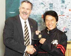 | Jerry Keller (L), Sheriff of the Las Vegas Metropolitan Police Department, presents Jackie Chan an honorary Sheriff's deputy badge during a ceremony in the Las Vegas City Hall, February 28, 2001. Chan, who is in Las Vegas filming a sequel to his movie Rush Hour with Chris Tucker, was also presented with a proclamation from the governor's office proclaiming February 28, 2001 as Jackie Chan Day in Nevada. |