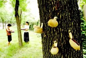 | Altogether 200 million Chouioia Cuneas, bred by a research institute in Tianjin, have been lately released in over 10 areas of Tianjin in order to kill the natural enemy-- American White Moth, thus protecting some 50,000 trees. Photo shows technicians fixing the pupa of Chouioia Cunea on trees during the pupation period of American White Moth. |
