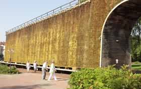 Some elderly people stroll by the Salt Wall, the so called "Urban Lung" in Bad Salzuflen City in Germany August 17, 2001. The 426-meter-long wall built with steel and tree roots, and permeated with salt and mineral water, may produce fresh air.