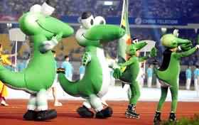 Four Chinese alligators named "Lala", the mascot of the Beijing Universiade, perform during the opening ceremony of the 21st World University Games in Beijing August 22, 2001. (