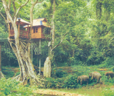 elephants stroll through the tropical jungle; next to top:Tree houses built in the valley