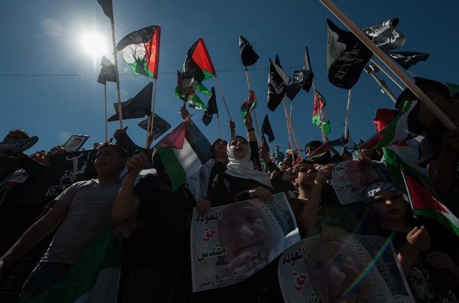 Protesters wave flags during a demonstration marking the 66th anniversary of the “Nakba,” meaning catastrophe, when many Palestinians fled or were expelled from their towns and villages during the war of Israel’s foundation in 1948, at Damascus Gate in Jerusalem’s Old City May 15, 2014. (Xinhua photo)
