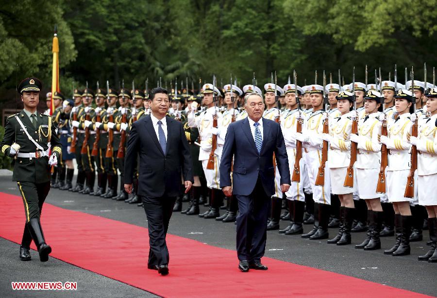 | Chinese President Xi Jinping (front L) holds a welcoming ceremony for President of Kazakhstan Nursultan Nazarbayev before their talks in Shanghai, east China, May 19, 2014. (Xinhua/Yao Dawei) |