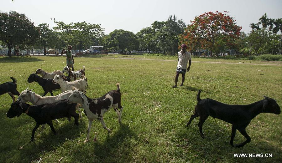 Shepherds herd goats at Maidan ground in Calcutta, capital of eastern Indian state West Bengal, May 20, 2014. (Xinhua/Tumpa Mondal)