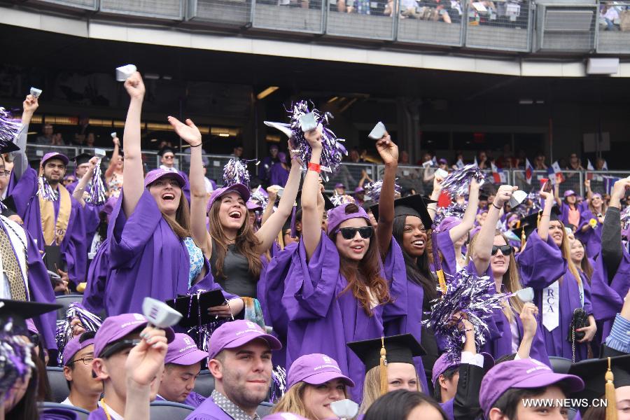 Students celebrate during the 182nd Commencement of the New York University at Yankee Stadium, New York, May 21, 2014. Some 8,000 graduates attended the commencement Wednesday. New York University was founded in 1831. (Xinhua/Huang Jihui)