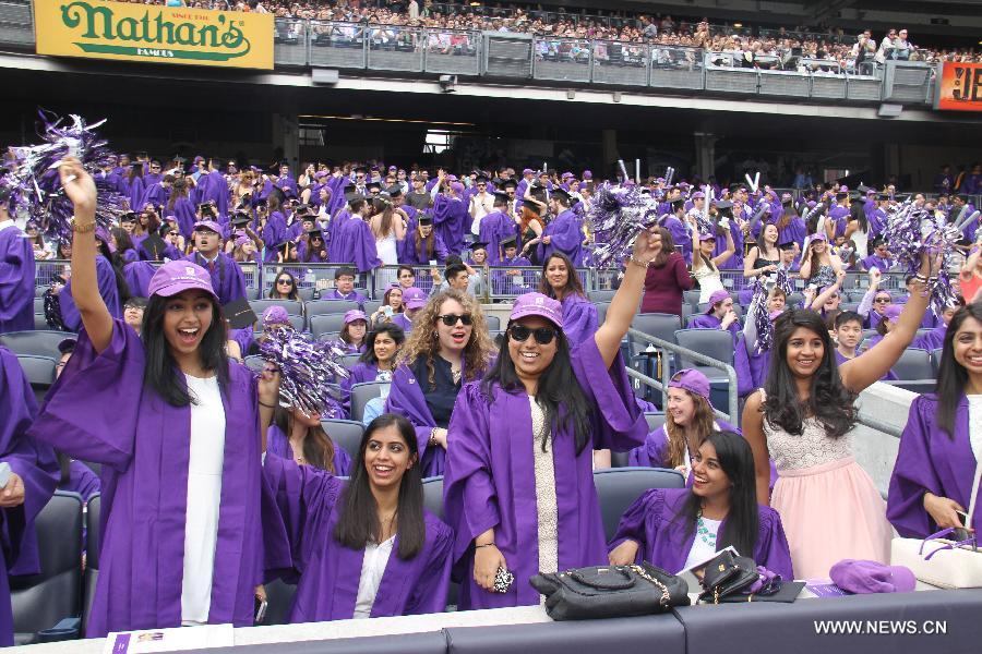 Students celebrate during the 182nd Commencement of the New York University at Yankee Stadium, New York, May 21, 2014. Some 8,000 graduates attended the commencement Wednesday. New York University was founded in 1831. (Xinhua/Huang Jihui)