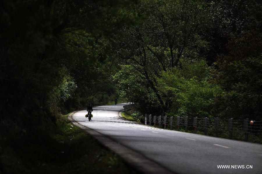 A cyclist rides along the Sichuan-Tibet Highway in Bomi County, southwest China's Tibet Autonomous Region, May 25, 2014. The scenery along the Sichuan-Tibet Highway, including glaciers, snow mountains, primeval forests, grasslands, canyons and rivers, attracts more and more cyclists to challenge themselves as well as enjoy the beauty. (Xinhua/Wen Tao)
