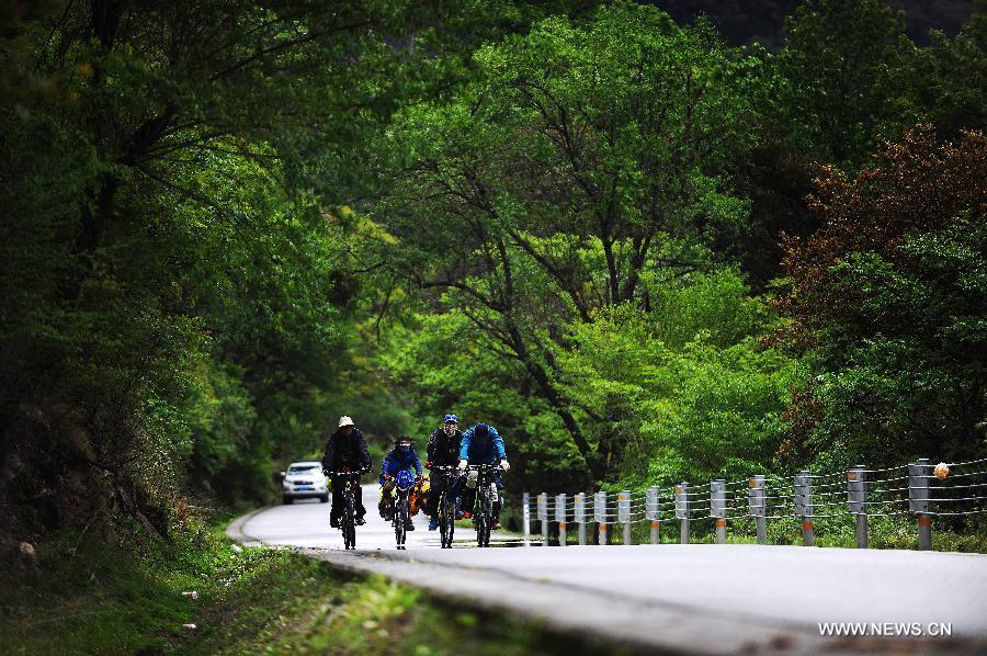 Four cyclists ride along the Sichuan-Tibet Highway in Bomi County, southwest China's Tibet Autonomous Region, May 25, 2014. The scenery along the Sichuan-Tibet Highway, including glaciers, snow mountains, primeval forests, grasslands, canyons and rivers, attracts more and more cyclists to challenge themselves as well as enjoy the beauty. (Xinhua/Wen Tao)