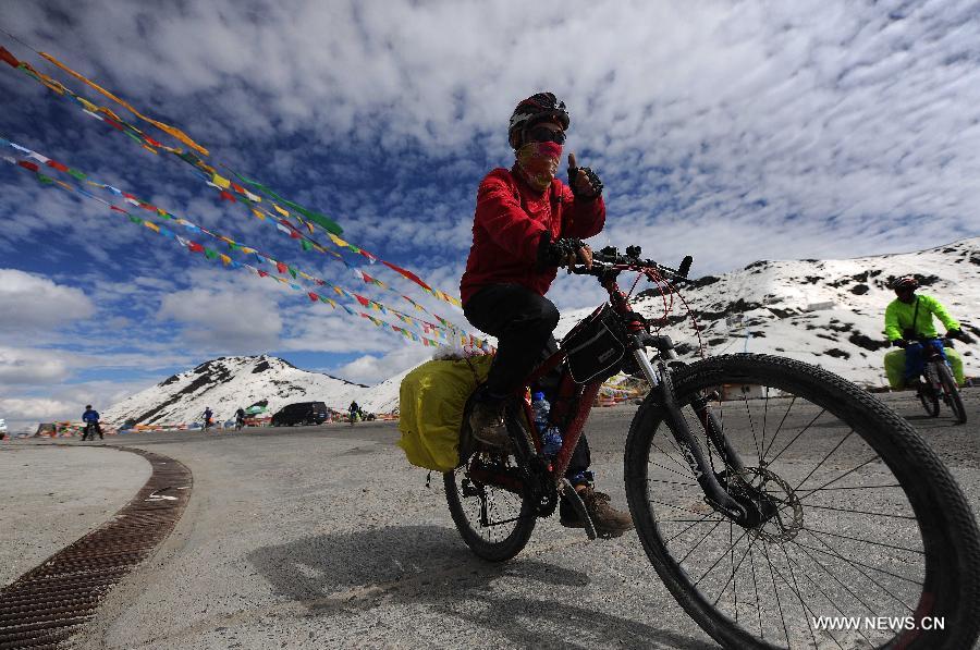 A cyclist rides along the Sichuan-Tibet Highway on the Segrila Mountain in Bomi County, southwest China's Tibet Autonomous Region, May 25, 2014. The scenery along the Sichuan-Tibet Highway, including glaciers, snow mountains, primeval forests, grasslands, canyons and rivers, attracts more and more cyclists to challenge themselves as well as enjoy the beauty. (Xinhua/Wen Tao)
