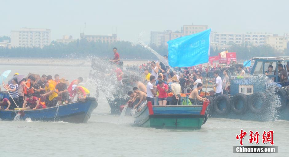 People splash water to celebrate the Dragon Boat Festival in Fujian, China on June 1, 2014.(CNS/Zhang Bin)