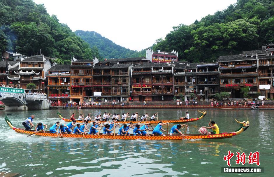 Competitors row in the dragon boat race on the Tuojiang River in Fenghuang, central China's Hunan Province to mark the Dragon Boat Festival on June 1, 2014.(CNS/Yang Huafeng)