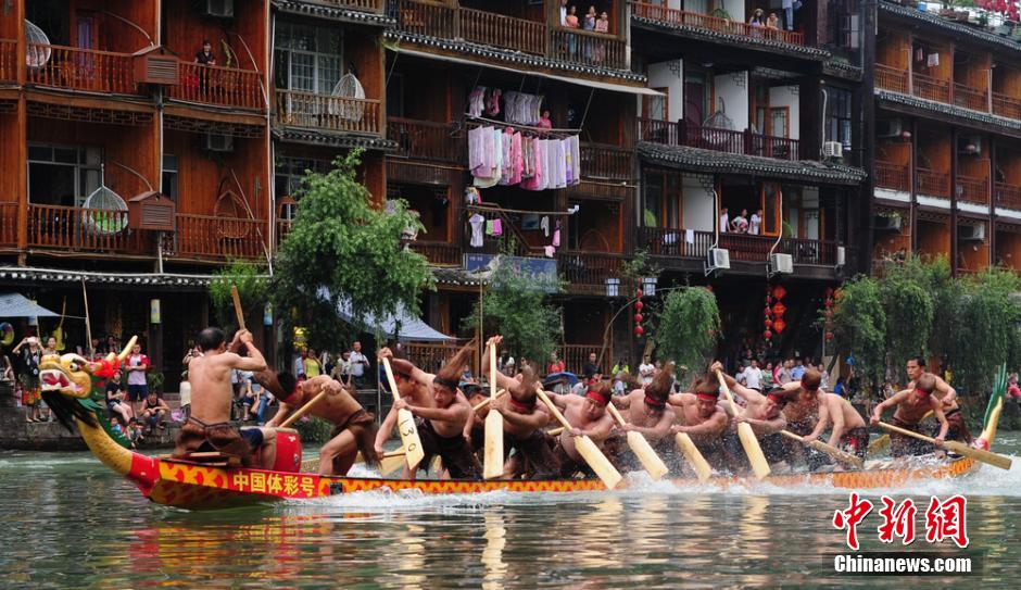 Competitors row in the dragon boat race on the Tuojiang River in Fenghuang, central China's Hunan Province to mark the Dragon Boat Festival on June 1, 2014.(CNS/Yang Huafeng)