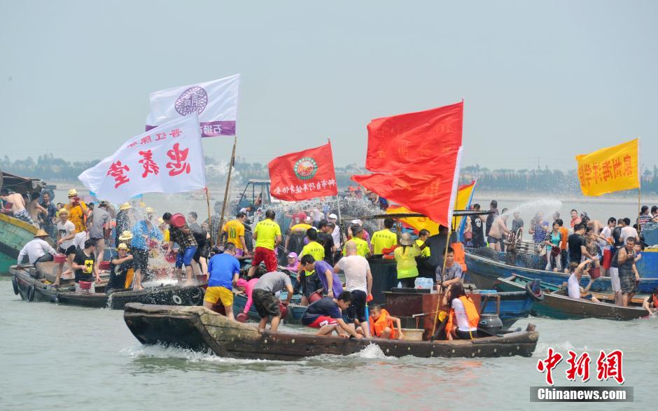 People splash water to celebrate the Dragon Boat Festival in Fujian, China on June 1, 2014.(CNS/Zhang Bin)