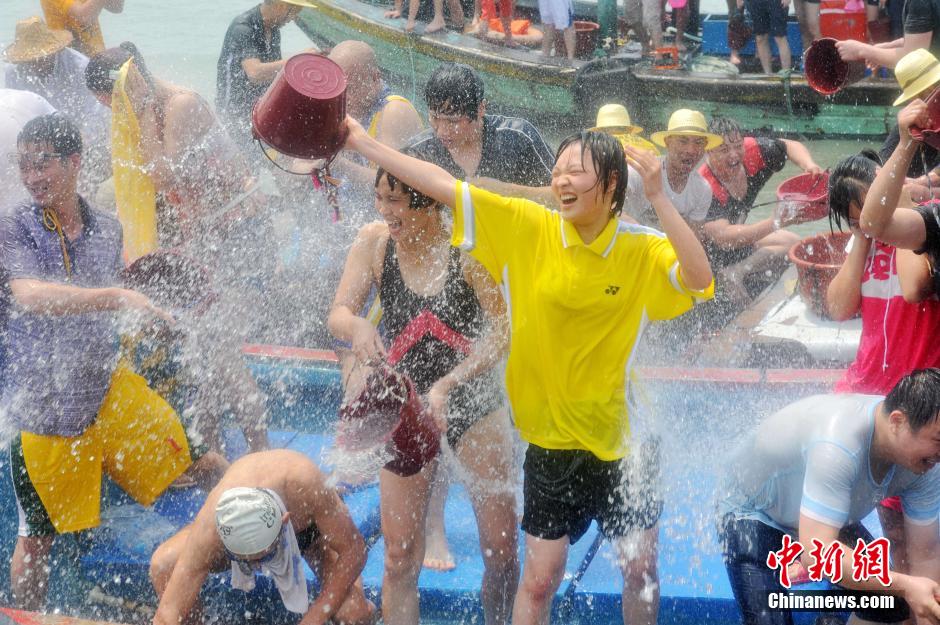 People splash water to celebrate the Dragon Boat Festival in Fujian, China on June 1, 2014.(CNS/Zhang Bin)