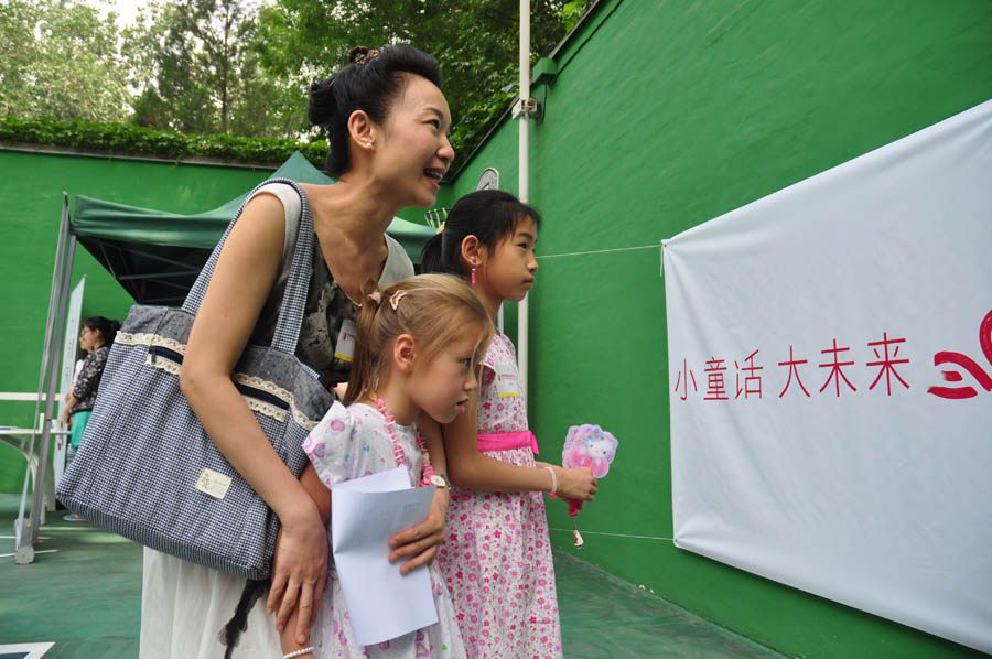 Visitors view the paintings drawn by Danish and Chinese children on the tennis court at the embassy on Open Denmark Day. (People’s Daily Online/ Gao Yinan)