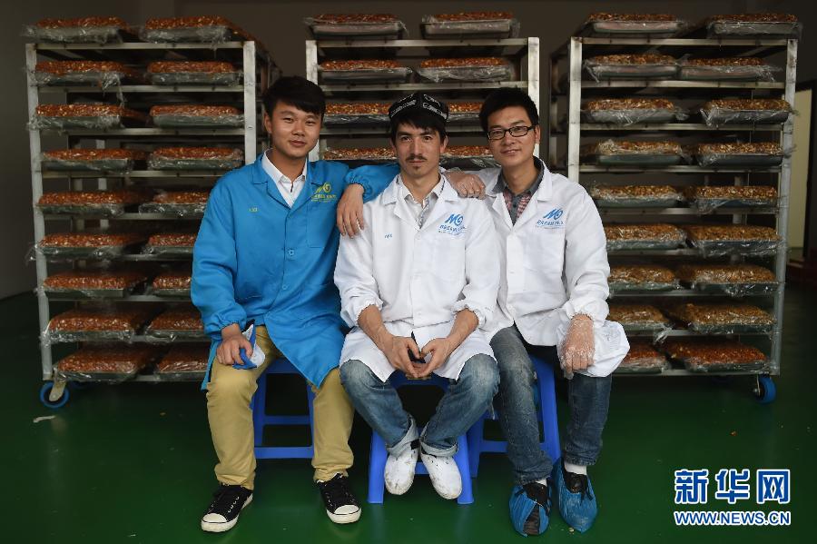 Adil Memettur, 23, a senior at Changsha University of Science and Technology in China's Hunan Province, started selling the popular Xinjiang snack "qiegao," literally "cut cake," on Taobao.com, China's most popular online shopping platform with help from classmates Jiang Jinya and Jiang Chunyang, both of whom are Han ethnicity. Qiegao, also called "matang" in Xinjiang Uygur Autonomous Region, is a dense nougat made from nuts, candied fruits, and malt syrup. It is usually shaped into large, thick sheets and sold on the back of motorized tricycles by Uygurs.