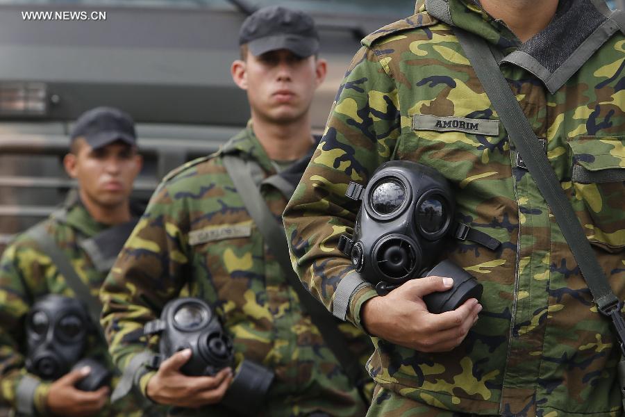 | Members of armed forces participate in operational training for FIFA World Cup in Brasilia, Brazil, June 8, 2014. About 3,900 Army, Navy and Air Force Soldiers will take part in the security operations during the World Cup in Brazil. (Xinhua/Dida Sampaio/Estadao Conteudo/Agencia Estado) |