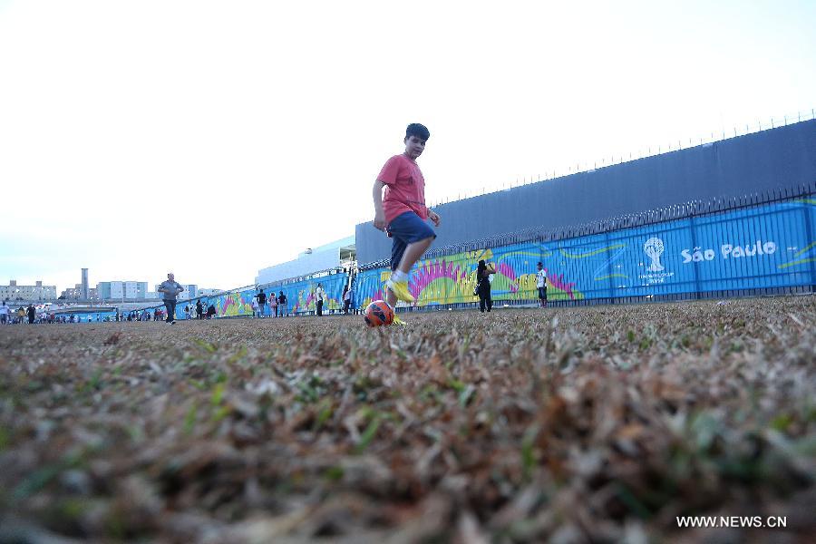 A boy plays soccer outside of Sao Paulo Arena, in Sao Paulo, Brazil, on June 8, 2014. The opening ceremony of 2014 FIFA World Cup Brazil will be host in the Sao Paulo Arena. (Xinhua/Rahel Patrasso)