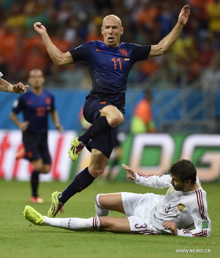 Paced by their talismen Arjen Robben and Robin van Persie, Netherlands notched a stunning 5-1 victory against Spain in the Group B opener here on Friday in what was a rematch of the 2010 World Cup final in South Africa. (Photo: Xinhua)