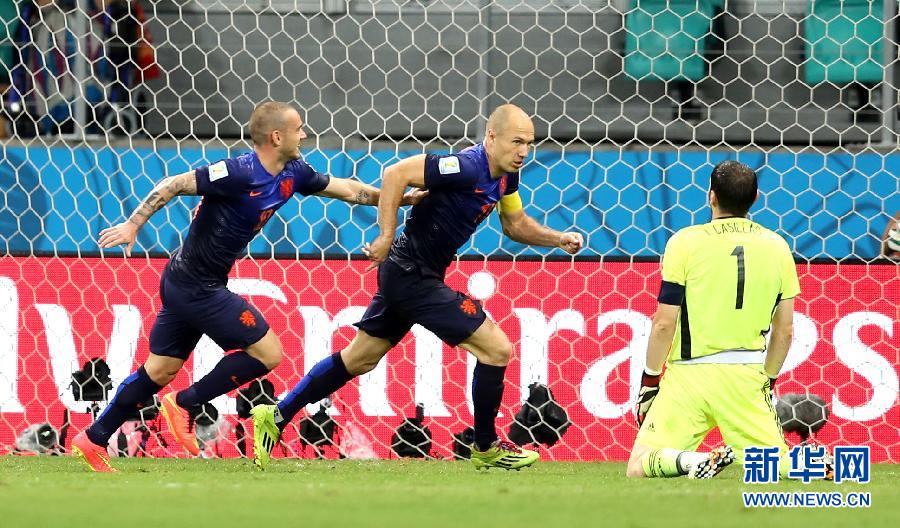 Paced by their talismen Arjen Robben and Robin van Persie, Netherlands notched a stunning 5-1 victory against Spain in the Group B opener here on Friday in what was a rematch of the 2010 World Cup final in South Africa. (Photo: Xinhua)