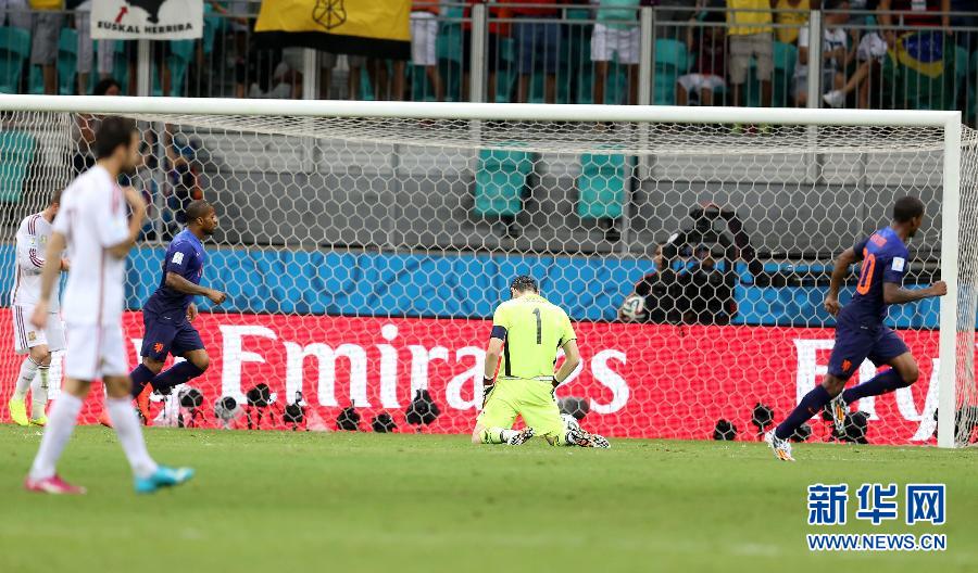 Paced by their talismen Arjen Robben and Robin van Persie, Netherlands notched a stunning 5-1 victory against Spain in the Group B opener here on Friday in what was a rematch of the 2010 World Cup final in South Africa. (Photo: Xinhua)