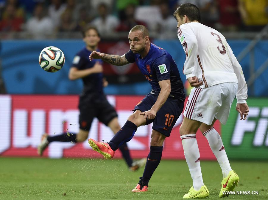 Paced by their talismen Arjen Robben and Robin van Persie, Netherlands notched a stunning 5-1 victory against Spain in the Group B opener here on Friday in what was a rematch of the 2010 World Cup final in South Africa. (Photo: Xinhua)