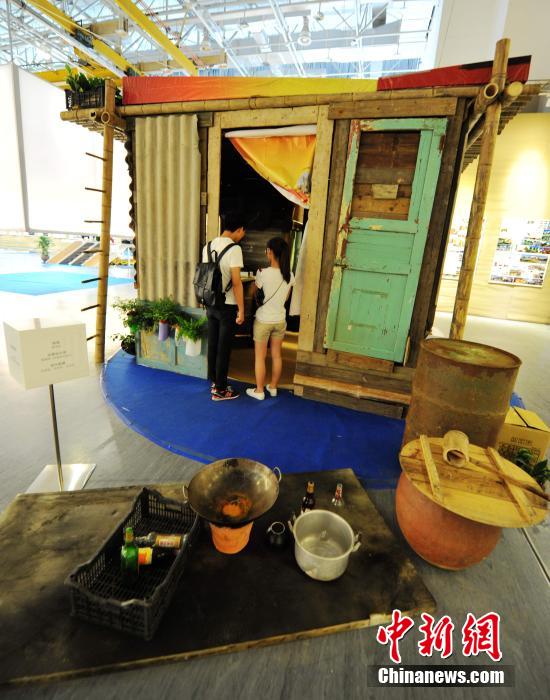 A hut, designed for vagabonds, is displayed at an exhibition in Xiamen, southeast China’s Fujian province on June 12, 2014. The environment-friendly hut is made of recycled wastes, such as obsolete doors, waste tiles and rusted oil drums, which are all reachable for the special vulnerable group. (CNS Photo / Zhang Bin)