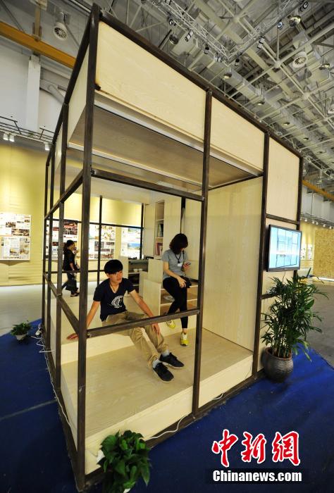 A hut, designed within a space measuring 3 meters long, 3 meters wide and 3 meters tall, with environment-friendly materials, is displayed at an exhibition in Xiamen, southeast China’s Fujian province on June 12, 2014. (CNS Photo / Zhang Bin)