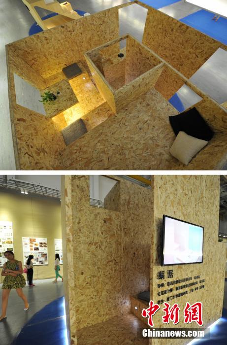 A hut, designed within a space measuring 3 meters long, 3 meters wide and 3 meters tall, with environment-friendly materials, is displayed at an exhibition in Xiamen, southeast China’s Fujian province on June 12, 2014. (CNS Photo / Zhang Bin)