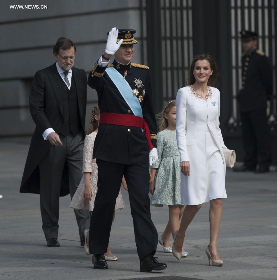 Spain's King Felipe VI (L, front) and Queen Letizia (R, front) attend a military review prior to the new king's succession ceremony in Madrid, Spain, June 19, 2014. Felipe VI was crowned on Thursday at the lower house of parliament. (Xinhua/Xie Haining)
