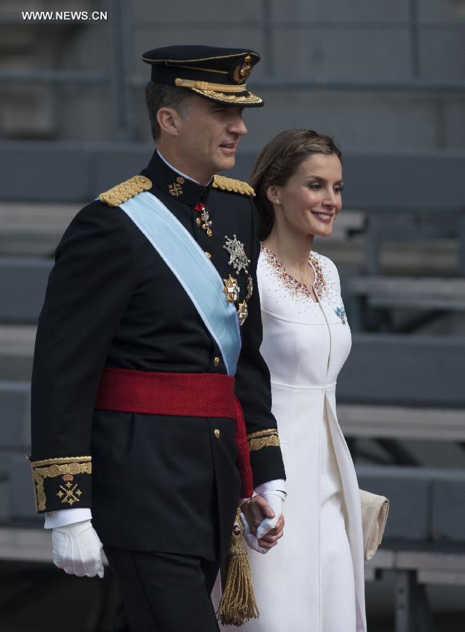 | Spain's King Felipe VI (L) and Queen Letizia attend a military review prior to the new king's succession ceremony in Madrid, Spain, June 19, 2014. Felipe VI was crowned on Thursday at the lower house of parliament. (Xinhua/Xie Haining) |