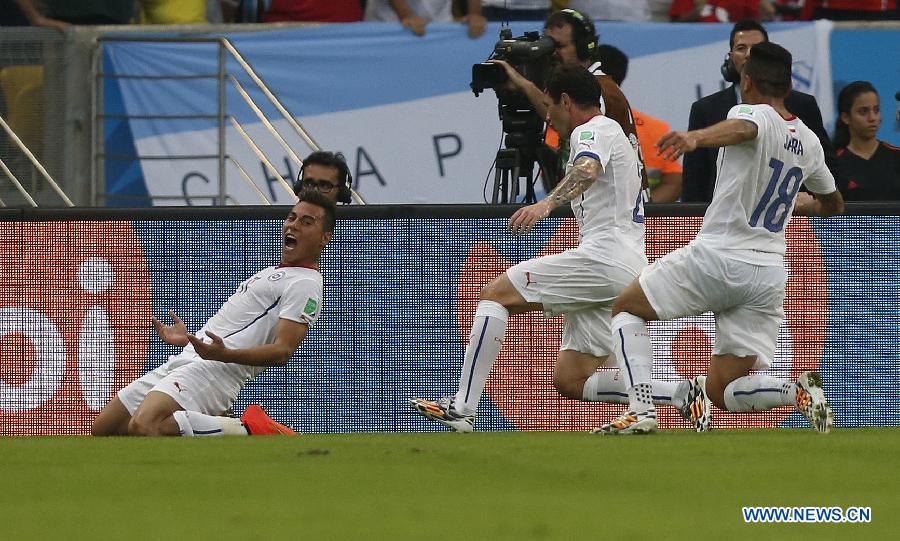 Chile's Eduardo Vargas (1st L) celebrates a goal during a Group B match between Spain and Chile of 2014 FIFA World Cup at the Estadio do Maracana Stadium in Rio de Janeiro, Brazil, June 18, 2014.(Xinhua/Wang Lili)