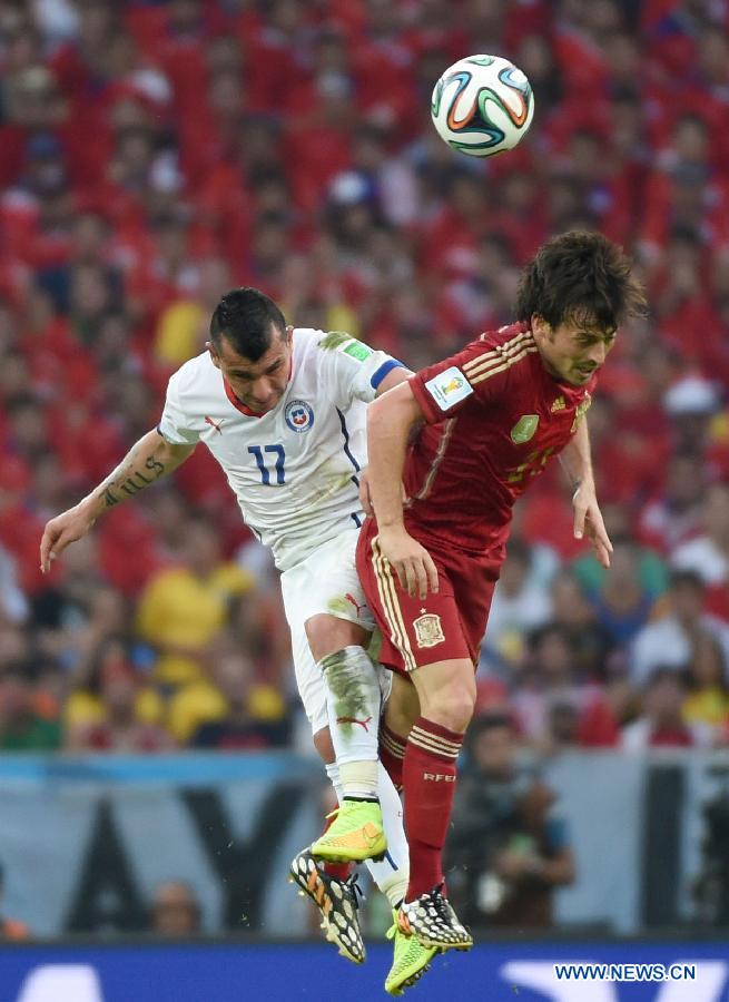 Spain's David Silva (R) competes for a header with Chile's Gary Medel during Group B match between Spain and Chile of 2014 FIFA World Cup at the Estadio do Maracana Stadium in Rio de Janeiro, Brazil, June 18, 2014.(Xinhua/Wang Yuguo)