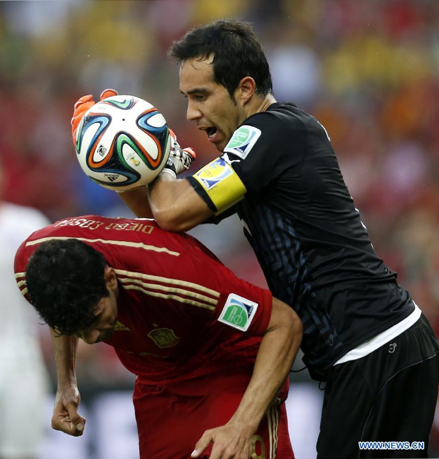 | Chile's goalkeeper Claudio Bravo competes for the ball with Spain's Diego Costa during a Group B match between Spain and Chile of 2014 FIFA World Cup at the Estadio do Maracana Stadium in Rio de Janeiro, Brazil, June 18, 2014.(Xinhua/Wang Lili) |