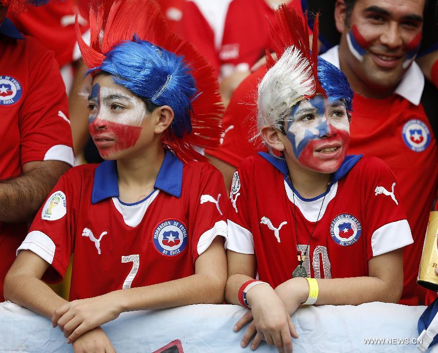 Chile's fans cheer before a Group B match between Spain and Chile of 2014 FIFA World Cup at the Estadio do Maracana Stadium in Rio de Janeiro, Brazil, June 18, 2014.(Xinhua/Wang Lili)
