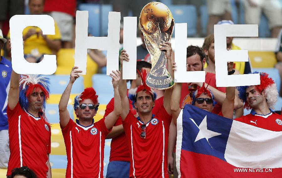 Chile's fans cheer before a Group B match between Spain and Chile of 2014 FIFA World Cup at the Estadio do Maracana Stadium in Rio de Janeiro, Brazil, June 18, 2014.(Xinhua/Wang Lili)