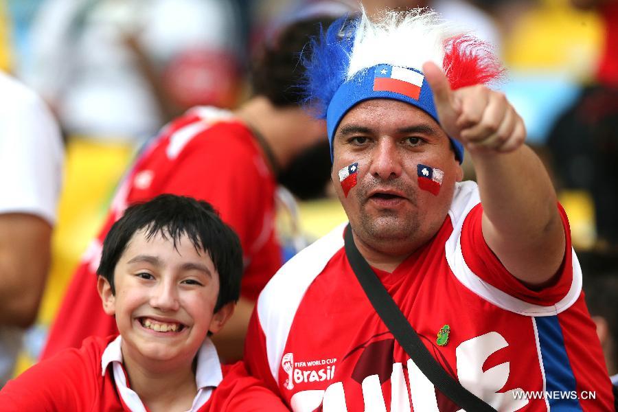Chile's fans cheer before a Group B match between Spain and Chile of 2014 FIFA World Cup at the Estadio do Maracana Stadium in Rio de Janeiro, Brazil, June 18, 2014.(Xinhua/Xu Zijian)